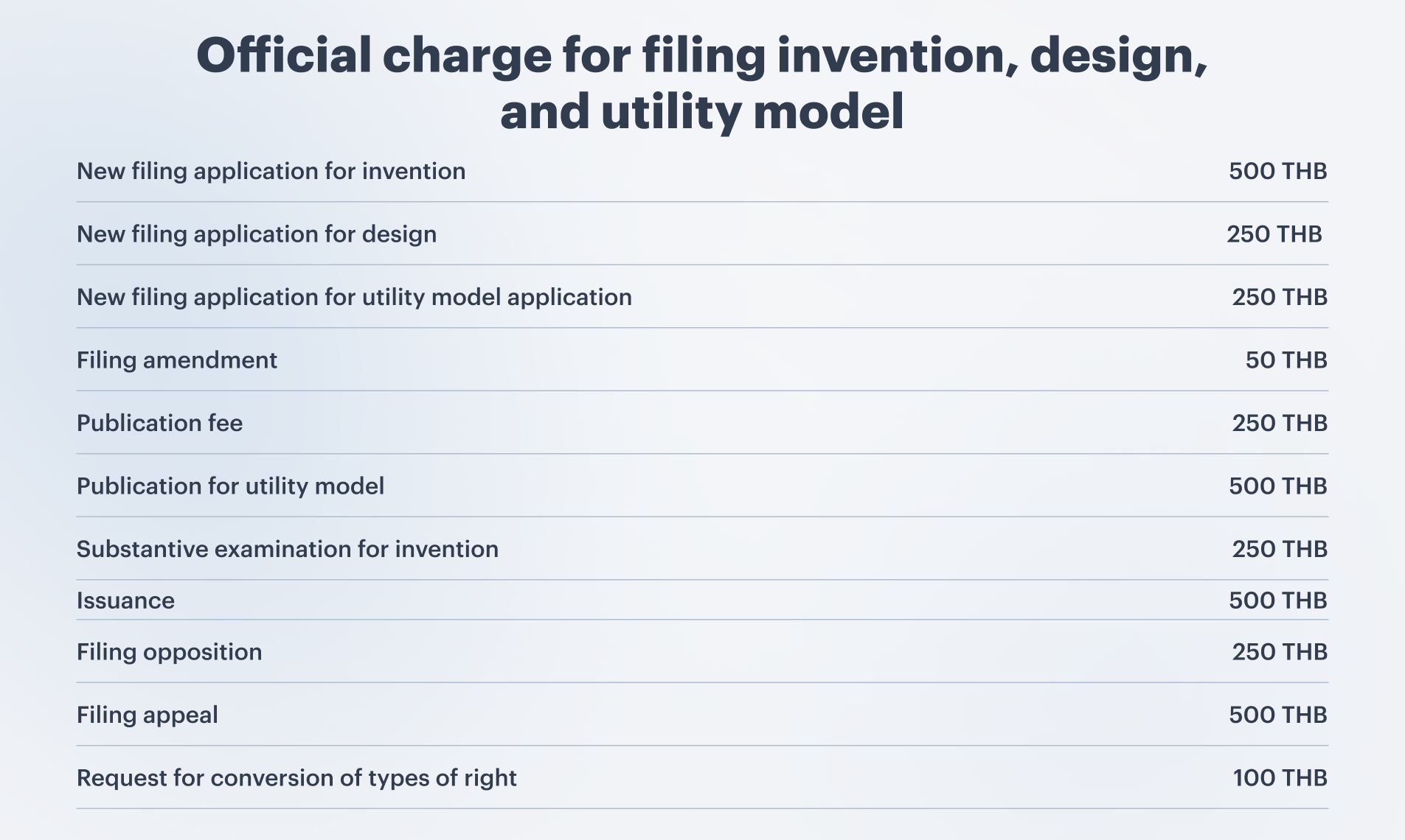 Under the current Act (Act B.E. 2522), the official cost payable to the Thai DIP are as follows: