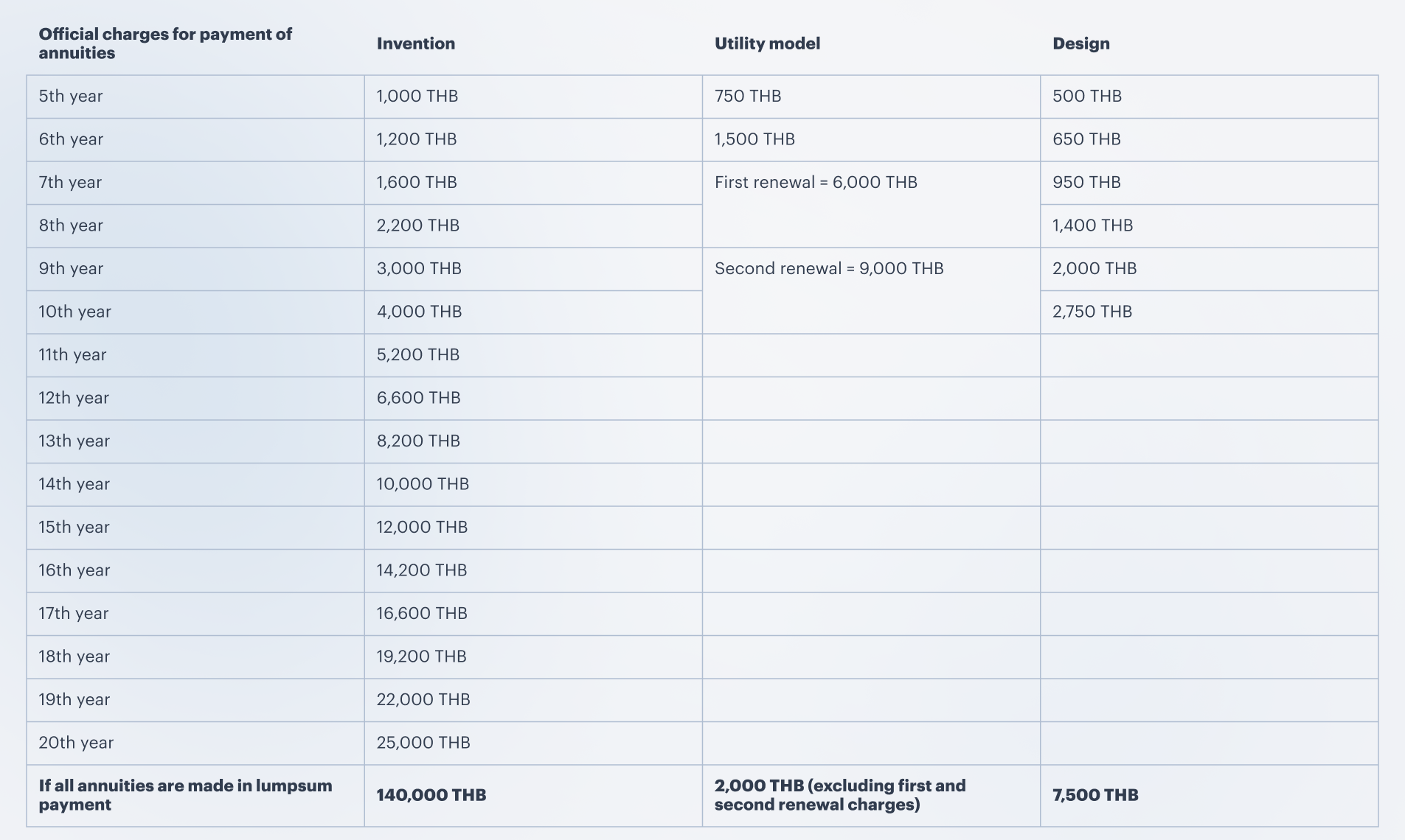 Annuity payment is payable upon grant from 5th year onwards. The official charges are as shown in the table below: