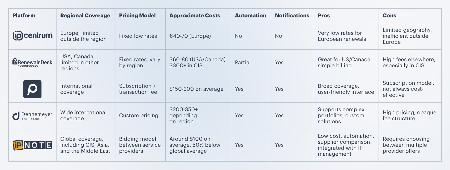 - PatentRenewal and Dennemeyer provide broader international coverage but tend to charge more than niche providers.