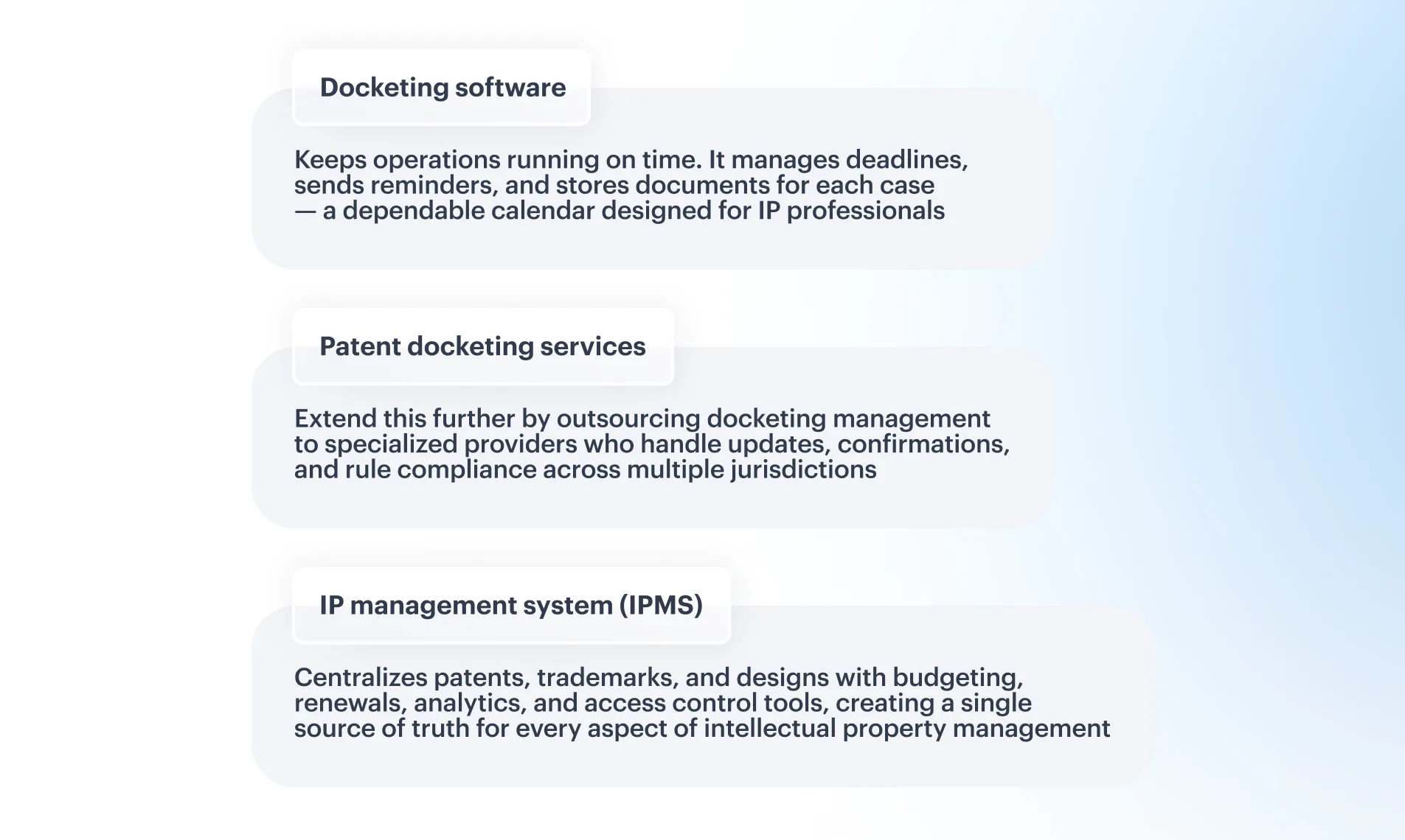 For small teams handling a limited number of cases, docketing software or patent docketing services cover the essentials — keeping everyone aware of deadlines and centralizing documents.