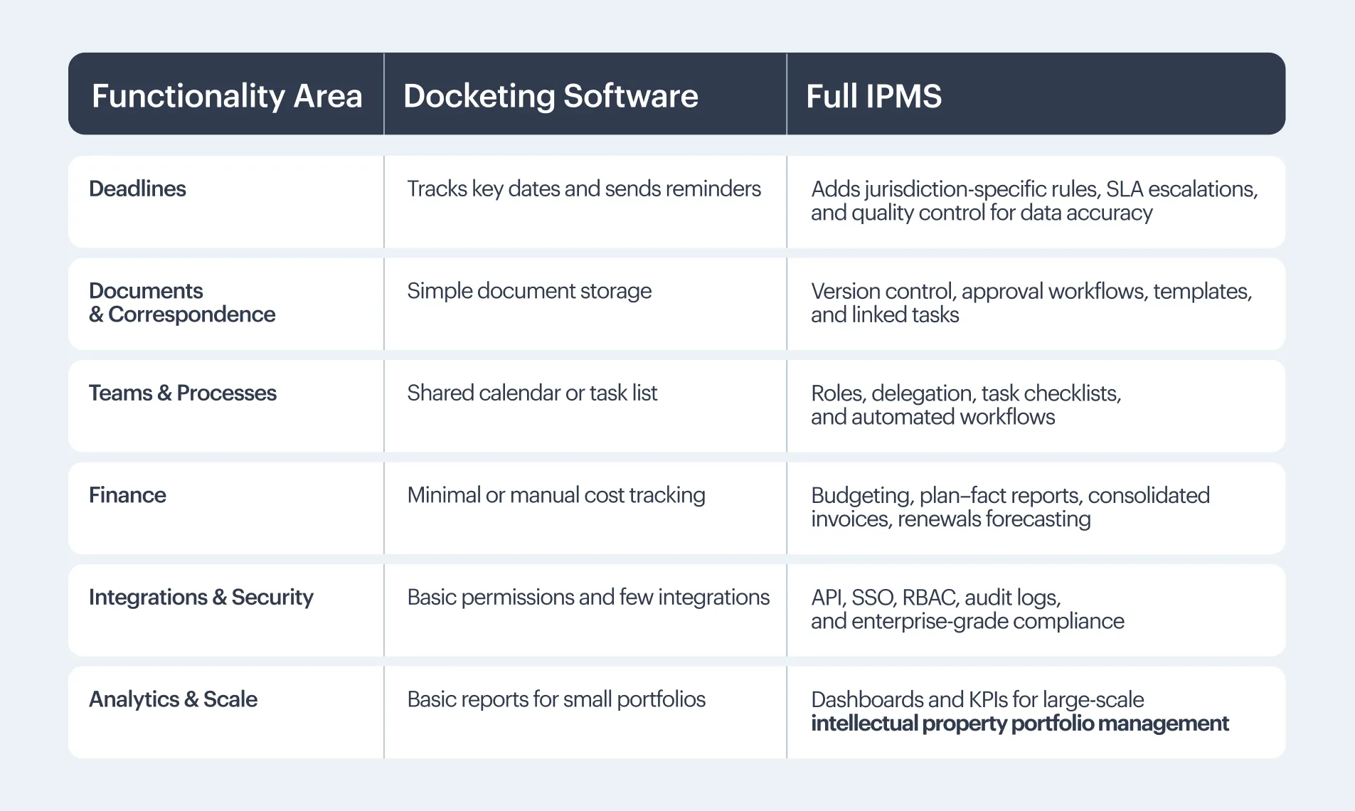 The distinction between docketing tools and IP management solutions becomes clear in daily operations: