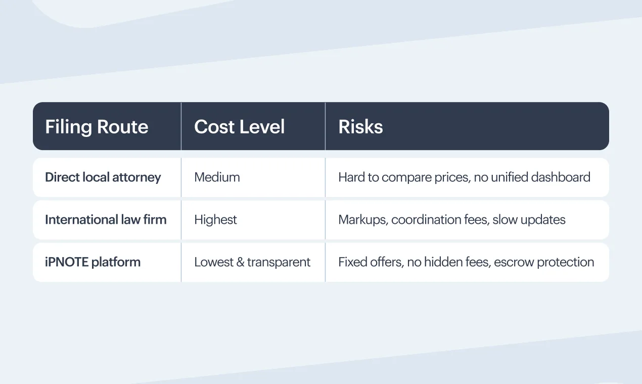In many Asian countries, non-residents must use a local agent. If this isn’t planned, attorney fees appear unexpectedly.