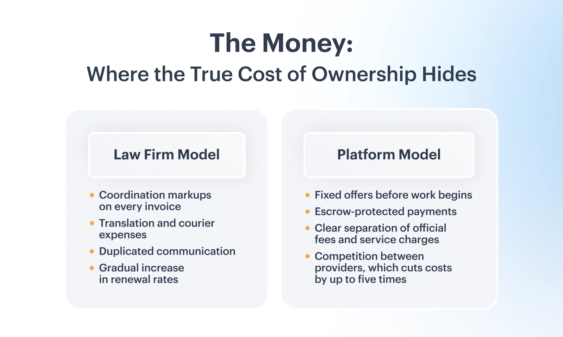 Financial visibility also suffers: invoices often show aggregated totals without a clear breakdown of local costs, taxes, or attorney fees. This complicates reporting and makes it difficult for teams responsible for company intellectual property to assess efficiency or compare countries.