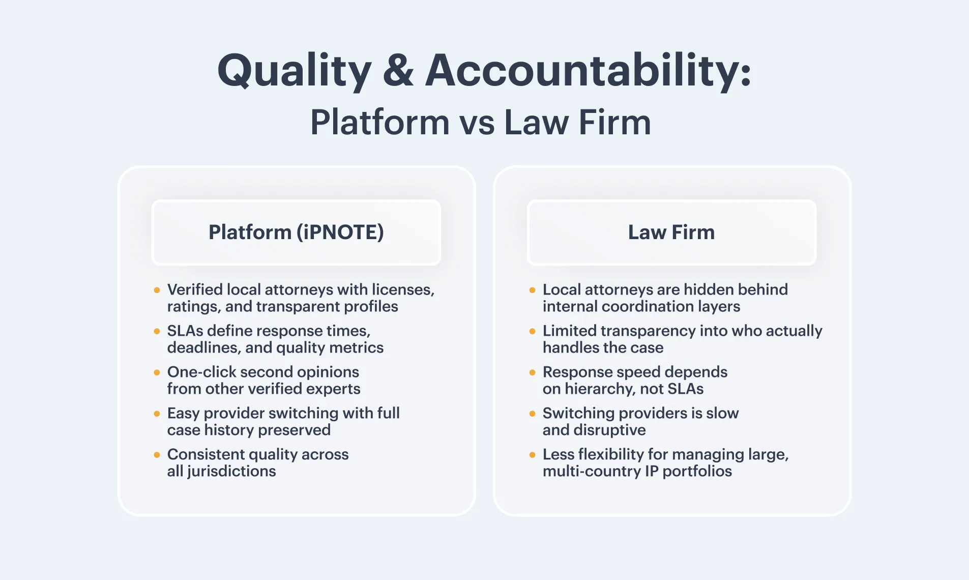 A global IP platform such as iPNOTE creates a transparent environment for managing intellectual property through verified and rated local providers. Each attorney is checked for license validity, jurisdictional experience, and professional background before joining the marketplace.