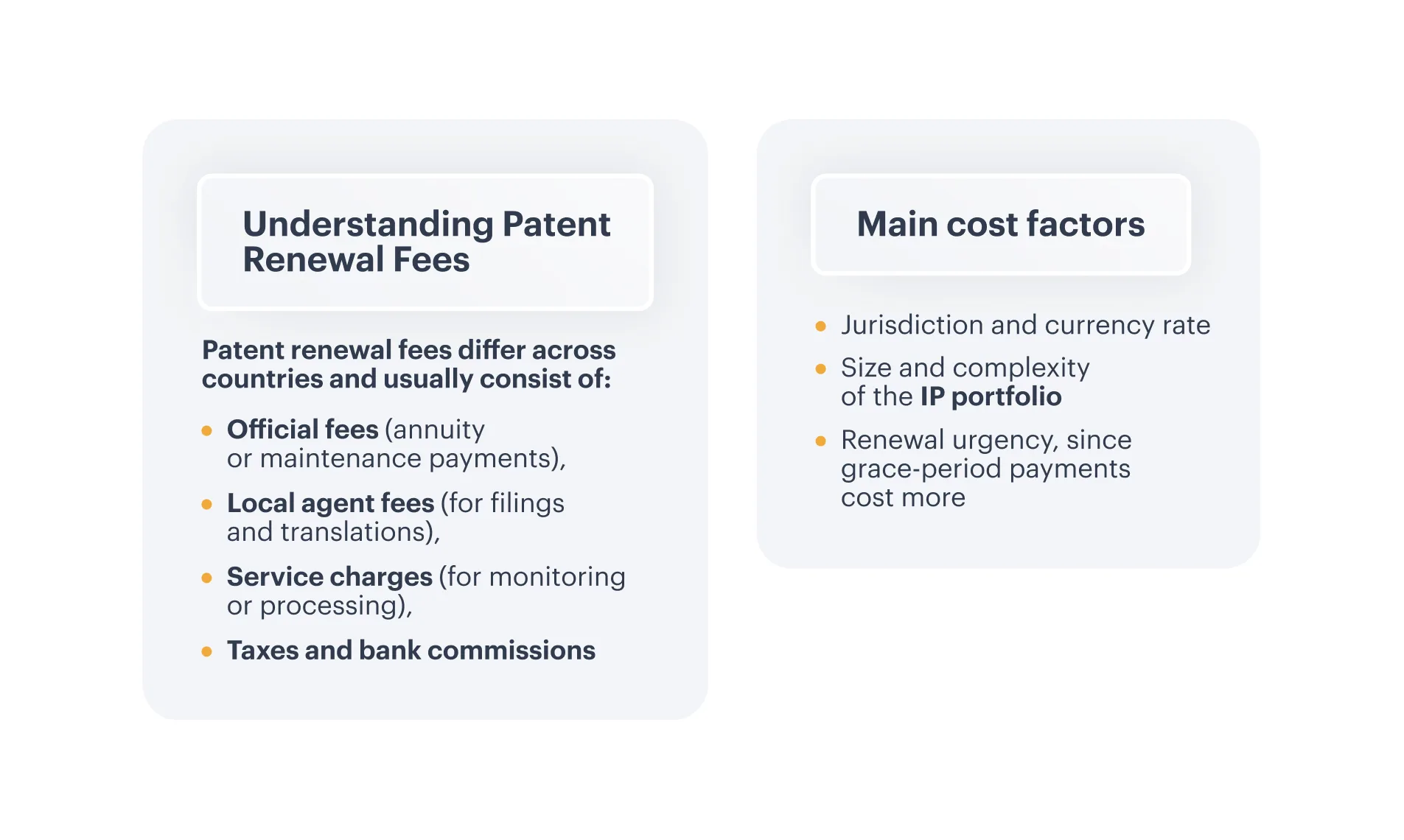 - Local agent fees — in most countries, filings and payments must go through accredited patent attorneys or local representatives. Their fees cover document handling, translations, and communication with the patent office.