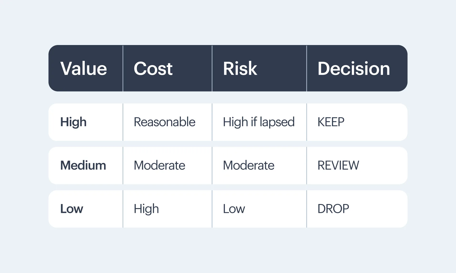 Not every patent should be renewed indefinitely. To make informed decisions, apply this simple matrix: