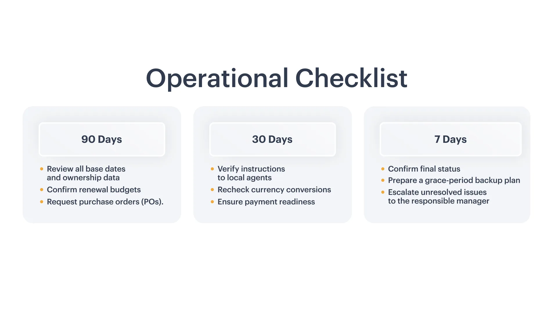 - 7 days before: double-check status, prepare a grace-period backup plan, and escalate if needed.