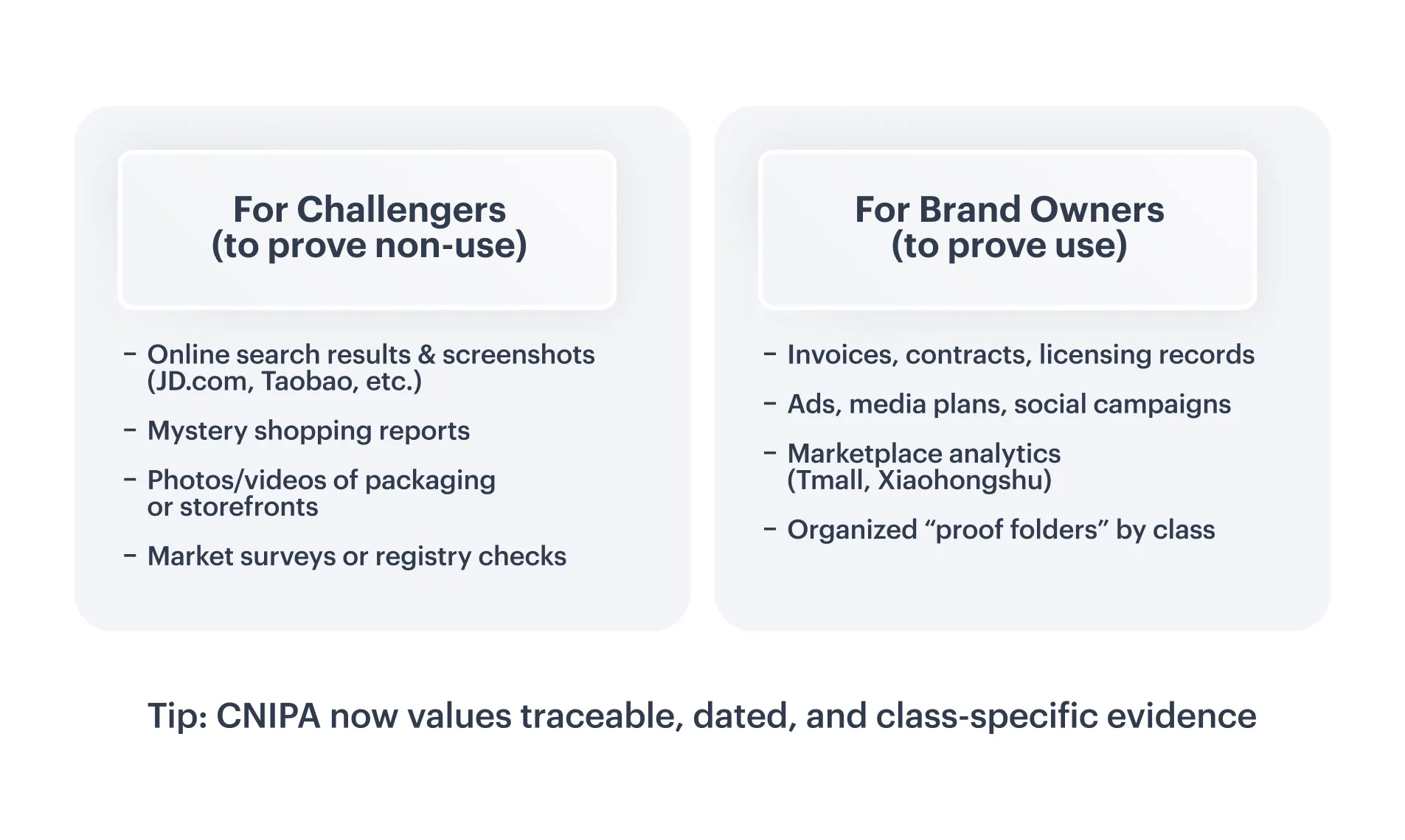 The revised CNIPA guidelines make one point clear: cancellation applications can no longer rely on assumptions. Every claim of non-use must be supported by tangible, verifiable evidence collected before the filing date. Likewise, brand owners defending their rights need organized, traceable documentation that proves genuine use in China.
