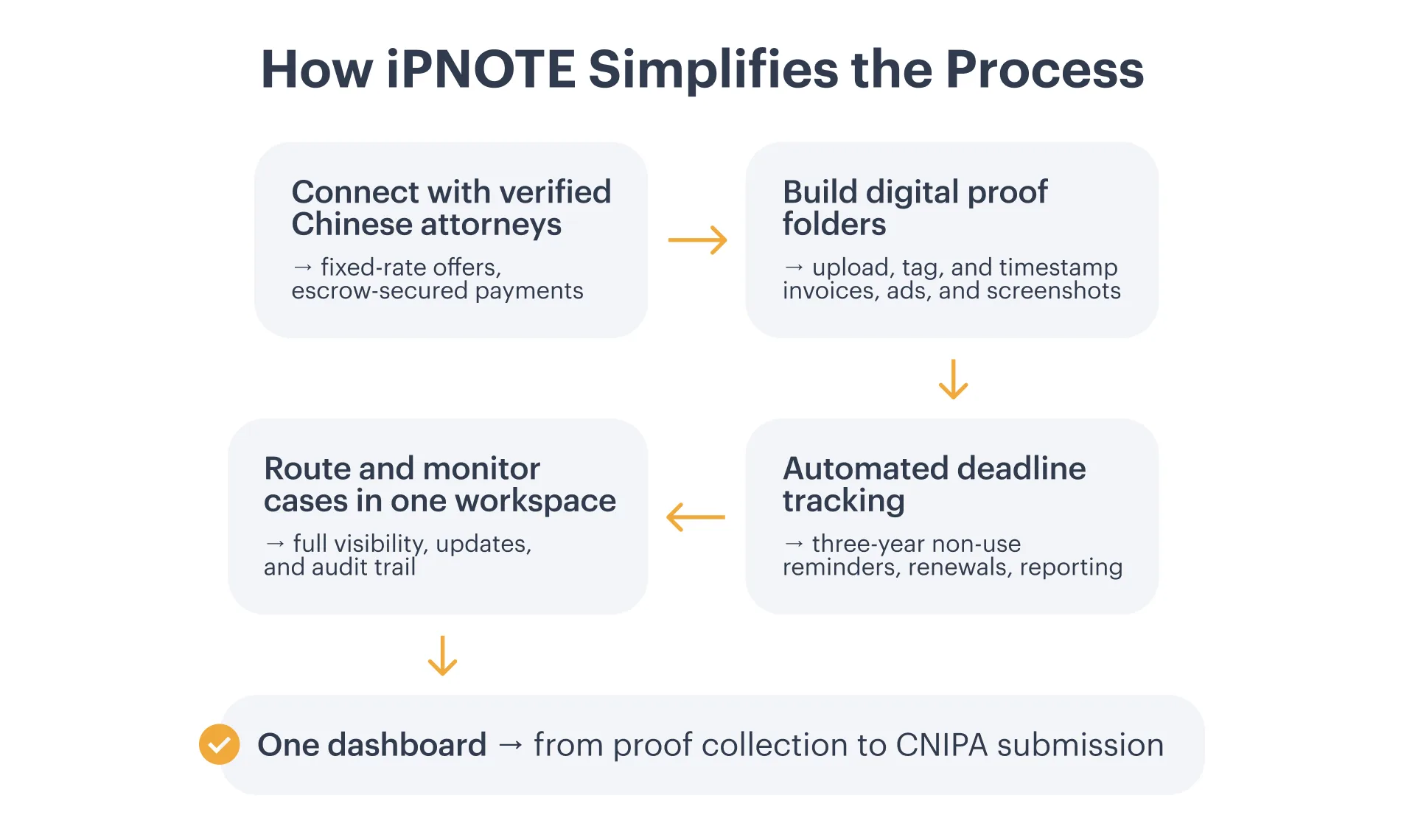 iPNOTE acts as a digital IP department for your China operations — combining automation, local expertise, and security. It helps you defend active marks, challenge dormant ones, and manage every procedural detail under CNIPA’s new stricter standards.