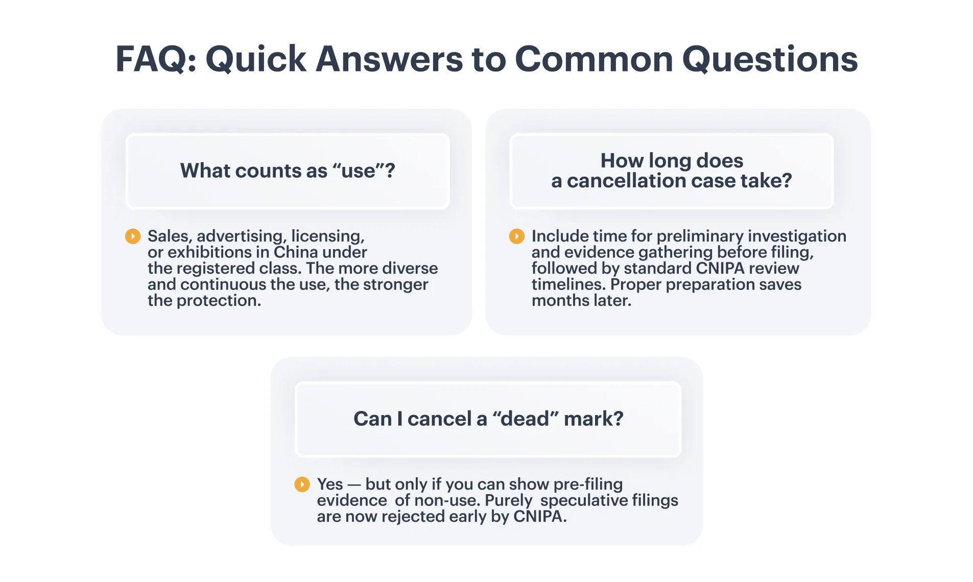 - Audit your Chinese trademarks by class and registration year to identify any marks nearing the three-year threshold.