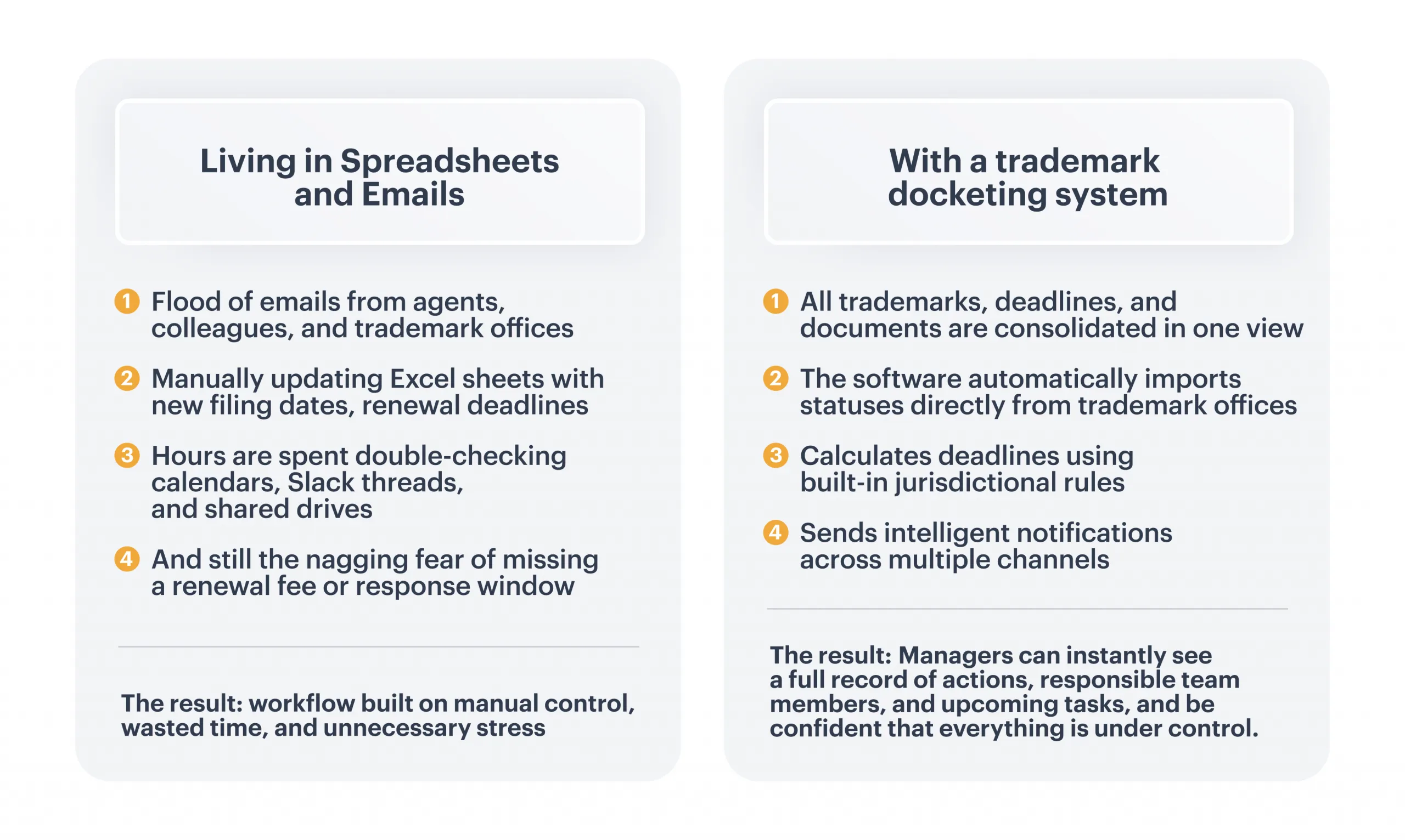 Many professionals will recognize the chaos of the old system — juggling emails, spreadsheets, and shared folders, and living with the constant anxiety of missing something crucial. The difference between life before and after implementing a TM-docketing system could not be clearer.