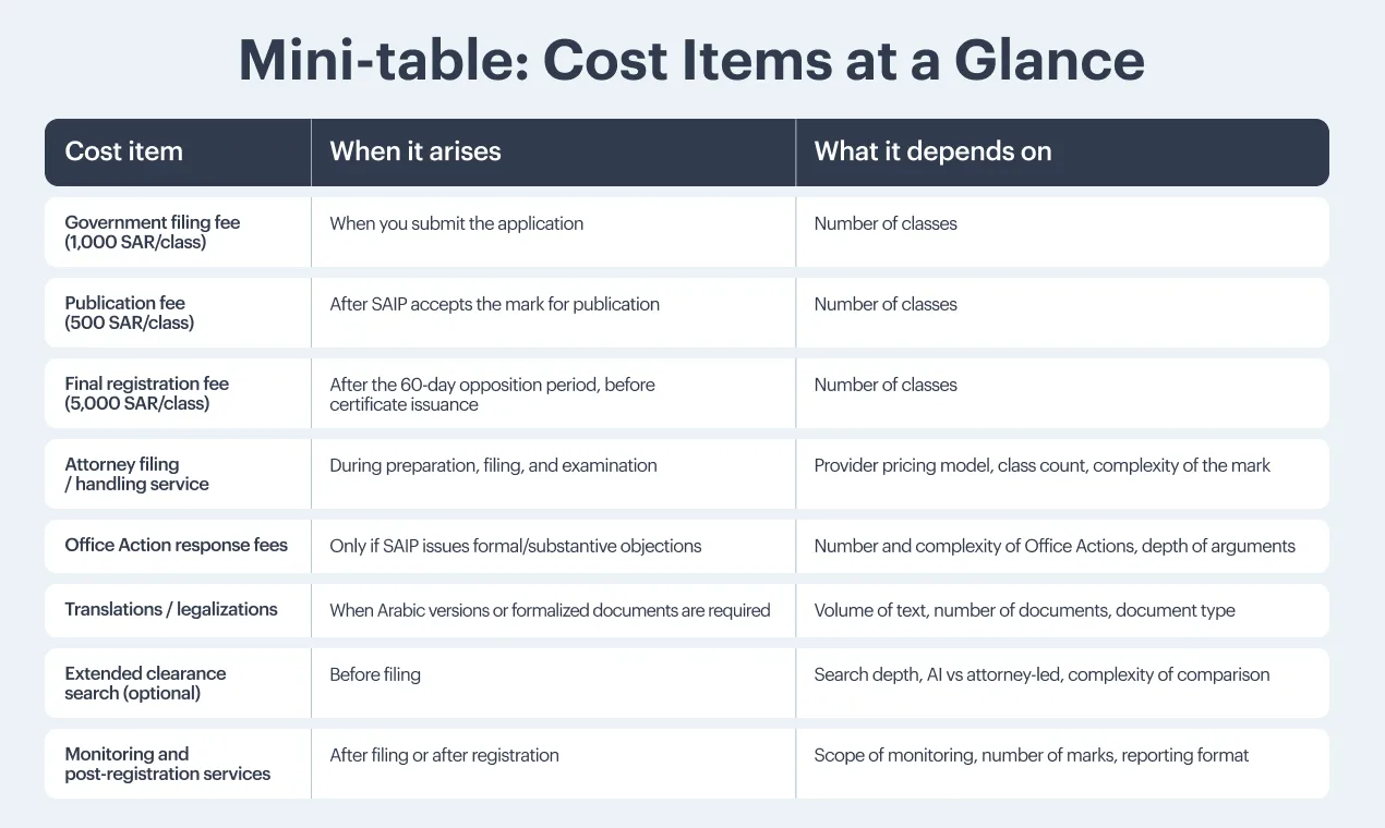 Every trademark project in Saudi Arabia is built from four main cost blocks:
