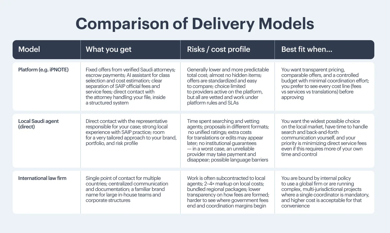 Compare a platform offer (e.g., iPNOTE) with proposals from local agents or a law firm. Always request a breakdown: government fees, attorney work, translations, and any optional services.